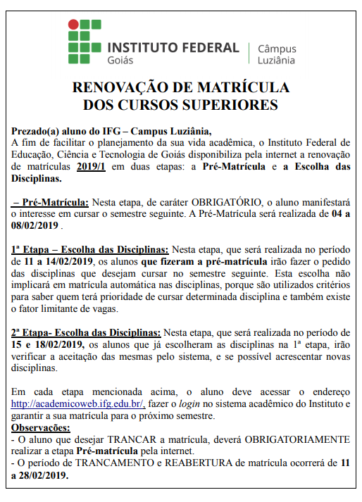 Você está aqui: Página inicial > Últimas Notícias > IFG > Câmpus > Luziânia > Notícias do Câmpus Luziânia > Período de renovação de matrícula começa hoje, 4