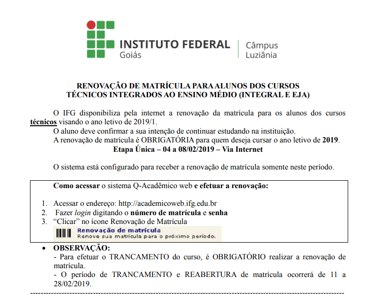 Os estudantes do Câmpus Luziânia devem se atentar às datas do período de renovação de matrícula para continuar os estudos em 2019. O processo começa hoje, 4 de fevereiro, e é feito exclusivamente pela página eletrônica do Q-Acadêmico (http://academicoweb.ifg.edu.br).