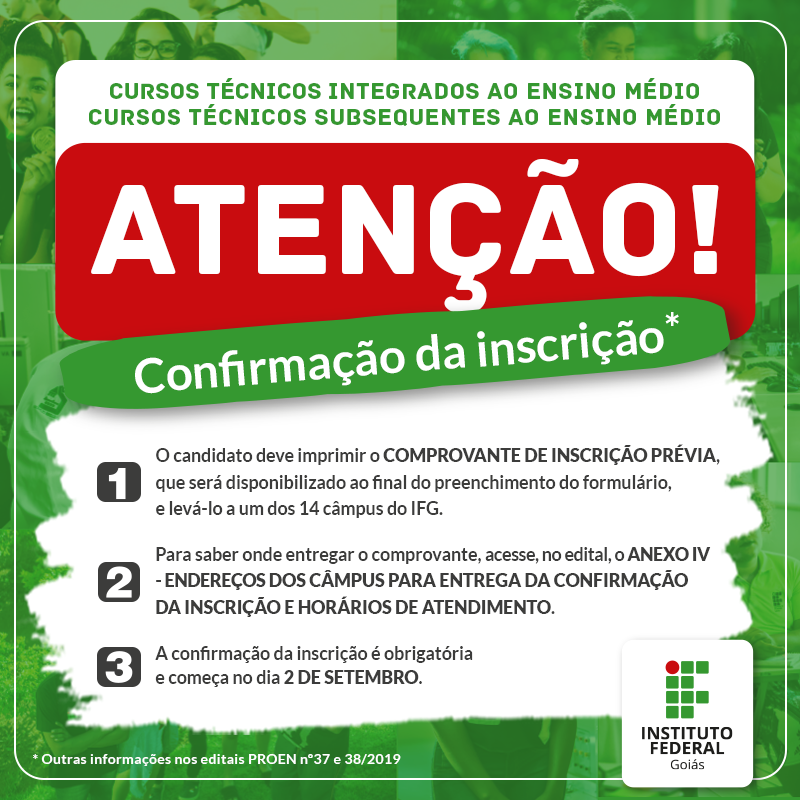ATENÇÃO: NESTA SELEÇÃO HÁ UMA MODIFICAÇÃO EM RELAÇÃO À CONFIRMAÇÃO DA INSCRIÇÃO. De acordo com o item 7 do Edital, a confirmação da inscrição dos cursos técnicos integrados só será efetivada a partir da impressão do comprovante, que será disponibilizado ao candidato no final do preenchimento do formulário online de inscrição, e da posterior entrega desse comprovante em qualquer uma das coordenações ou gerências de administração acadêmica e apoio ao ensino dos 14 câmpus do IFG. Esse passo é fundamental para validar e confirmar a inscrição do candidato.