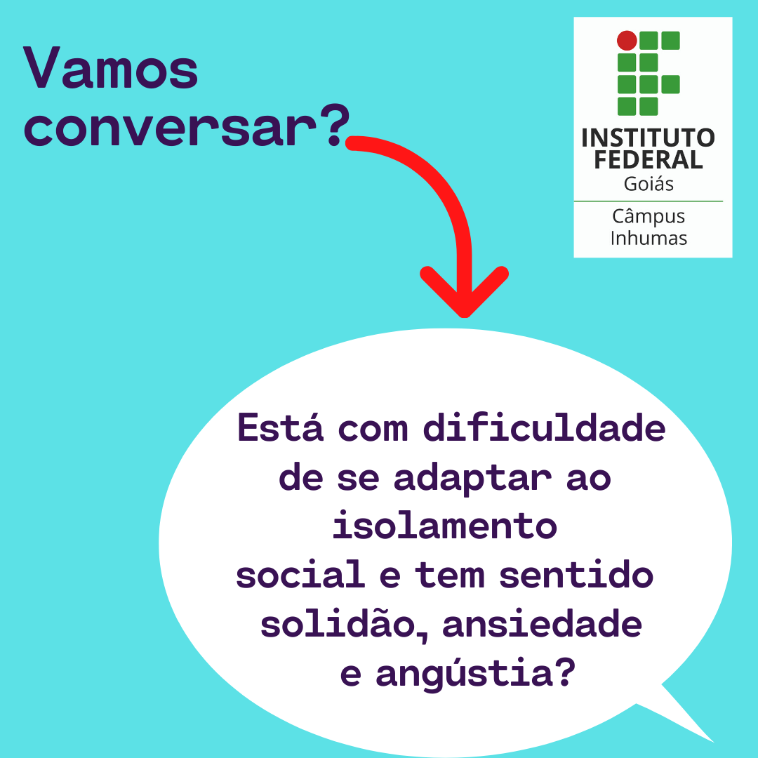 No Câmpus Inhumas, desde o início de abril, tem sido realizado um projeto pela Coordenação de Assistência Estudantil (CAE) e pela Coordenação de Apoio Pedagógico ao Discente (Capedisc). Intitulado “Vamos Conversar?”, o projeto oferece aos alunos um espaço on-line de escuta e aconselhamento psicológico nesse momento de isolamento social em razão da pandemia do novo coronavírus. Os interessados devem entrar em contato com os psicólogos do Câmpus Inhumas por e-mail: alex.barra@ifg.edu.br ou andre.antunes@ifg.edu.br. Posteriormente, os servidores farão os agendamentos das conversas. Os atendimentos são feitos de acordo com a disponibilidade do aluno, utilizando as ferramentas on-line mais acessíveis.
