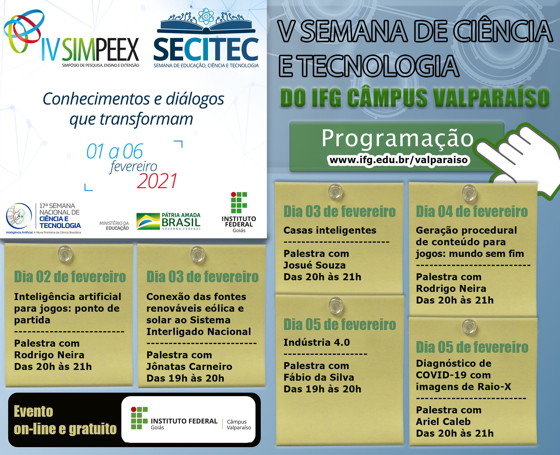 O Instituto Federal de Goiás (IFG) Câmpus Valparaíso irá realizar sua 5º edição da Semana de Ciência e Tecnologia junto ao IV Simpósio de Ensino, Pesquisa e Extensão (Simpeex). O Simpeex acontece de 1º a 6 de fevereiro, o Câmpus Valparaíso irá oferecer atividades do dia 02 a 05 de fevereiro. O público poderá contar com diversas temáticas na área de tecnologia, entre elas: indústria 4.0, inteligência artificial, casa inteligente. Legal, não é? O evento é on-line, gratuito, com direito à certificado. Vagas limitadas! Inscrições abertas! Link para se inscrever: https://sugep.ifg.edu.br/eventos/#/publico/eventos/c5fd0178-bf40-4629-99f2-4cdd02b123ad/inscricao .