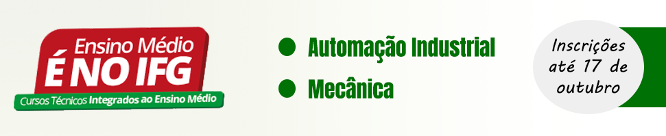 Você termina o ensino fundamental este ano? Sim, então, temos uma boa notícia! Venha fazer o ensino médio e no mesmo período cursar uma educação profissional! São 30 vagas para o curso técnico integrado em Automação Industrial e 30 vagas para o curso técnico integrado em Mecânica (aulas em período integral- manhã e tarde; de segunda a sexta-feira). Inscrições até o dia 17 de outubro, e apenas pela internet, no endereço eletrônico: www.ifg.edu.br/estudenoifg , menu: "TÉCNICO INTEGRADO".