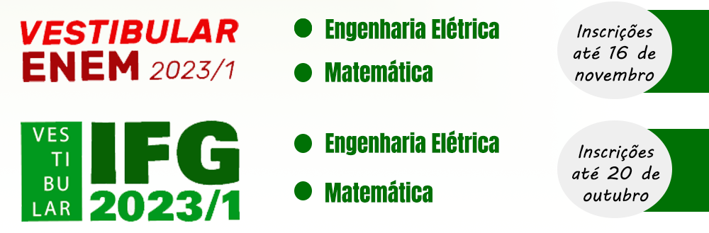 Que tal começar uma graduação ano que vem? Para o Câmpus Valparaíso, são duas possibilidades: Engenharia Elétrica e Matemática. Para o Vestibular Enem, é possível optar pelo sistema universal ou reserva de vagas. Já no Vestibular IFG, para o Câmpus Valparaíso, vagas destinadas à política de ações afirmativas. Atenção! São duas seleções distintas! Vestibular Enem, inscrição até 16 de novembro; Vestibular IFG, inscrição até 20 de outubro. Página das seletivas: www.ifg.edu.br/estudenoifg  menu: "Vestibular".
