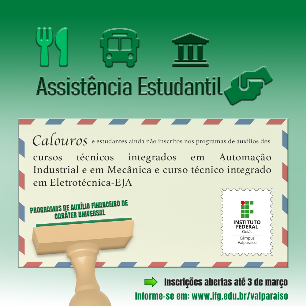 Edital e anexos na página: www.ifg.edu.br/valparaiso/campus/extensao/assistencia-estudantil?showall=&start=2