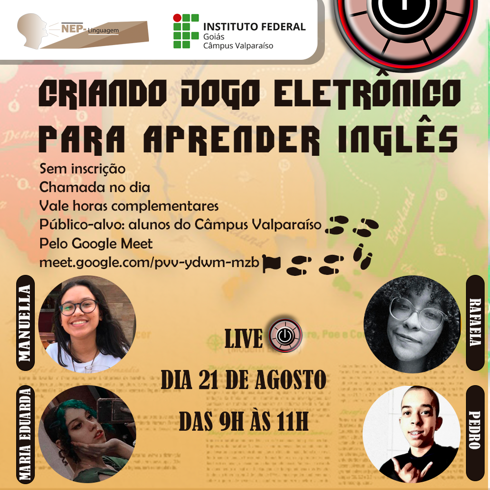 Na live de sábado, 21 de agosto, a equipe do projeto vai apresentar o trabalho desenvolvido e responder a pergunta: como se cria um jogo eletrônico? Venha participar!