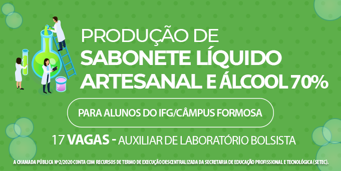 Abriu hoje o período de inscrições para um total de 17 vagas de auxiliar de laboratório bolsista que irá atuar na produção de produtos higienizadores, no Laboratório de Química do Câmpus Formosa do Instituto Federal de Goiás (IFG). Alunos de todos os cursos de ensino médio, de graduação e pós-graduação poderão participar desta Chamada Pública (nº02/2020), referente à ação de extensão “Proposta de Produção de Sabonete Líquido Artesanal e Formulações de Álcool 70% Glicerinado e Álcool Gel 70% em Estímulo à Higienização durante/Pós-Pandemia no Combate e Prevenção da Covid-19”, proposta pelo professor Diego Alves Rodrigues.