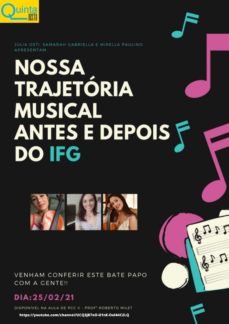 Dia 25 de fevereiro tem mais uma edição do projeto Quinta Justa do Câmpus Goiânia do Instituto Federal de Goiás. Dessa vez, as alunas do curso de Licenciatura em Música, Iulia Cristina Ossi, Mirella Mendanha e Samarah Duarte, apresentam o concerto Nossa trajetória musical antes e depois do IFG. A live será transmitida no canal no Youtube do Quinta Justa, às 18 horas.