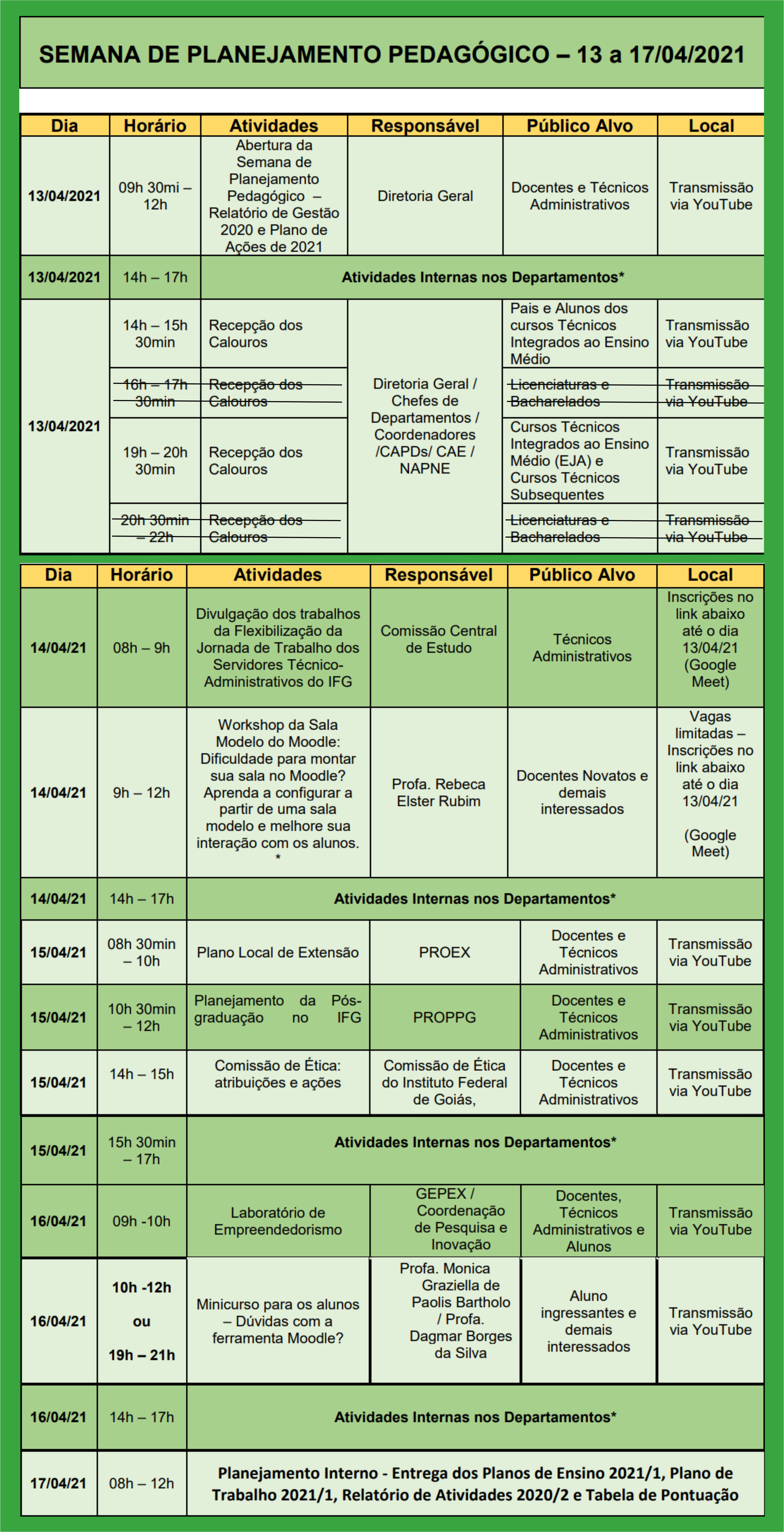 Na Semana de Planejamento Pedagógico 2021/1 do Câmpus Goiânia do IFG estão programadas ainda atividades internas nos departamentos de áreas acadêmicas no dia 14 de abril. Nesta mesma data, das 8h às 9h, haverá apresentação dos trabalhos sobre a flexibilização da jornada de trabalho dos servidores técnico-administrativos do IFG feita pela Comissão Central de Estudo, no canal do YouTube. A atividade é direcionada aos servidores técnico-administrativos da unidade e requer inscrição prévia para participação.