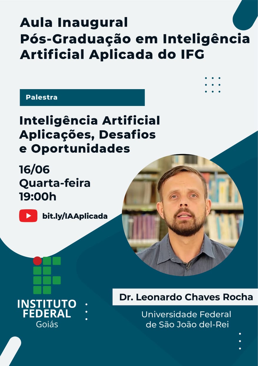 A Coordenação do curso de especialização em Inteligência Artificial Aplicada do Instituto Federal de Goiás (IFG) realiza no próximo dia 16 de junho, quarta-feira, às 19 horas, a aula inaugural da pós-graduação. O evento contará com palestra do docente Leonardo Chaves Rocha, da Universidade Federal de São João del-Rei. Segundo o professor do Câmpus Goiânia do IFG e coordenador da especialização, Eduardo Noronha, a comunidade poderá acompanhar a transmissão da aula pelo Youtube, no canal do Câmpus Anápolis, unidade parceira da pós-graduação.