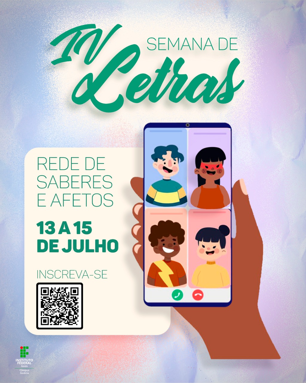 O Câmpus Goiânia do Instituto Federal de Goiás (IFG) realiza entre os dias 13 e 15 de julho a IV Semana de Letras e o III Ciclo de Debates: Rede de Saberes e Afetos. O evento será aberto às comunidades interna e externa, principalmente a pesquisadores e educadores, com transmissão pelo canal da Letras no Youtube. Interessados em submeter trabalhos podem enviar resumos de 17 a 2 de julho, por meio da página: https://www.even3.com.br/ivsemanadeletras2021/ . As inscrições enquanto ouvintes estarão abertas até dia 12 de julho, também pelo site do evento.