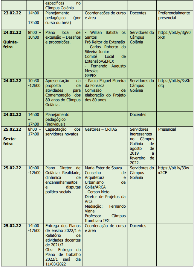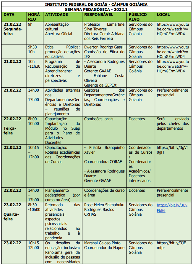 O Câmpus Goiânia do Instituto Federal de Goiás (IFG) realiza entre os dias 21 e 25 de fevereiro a Semana de Planejamento Pedagógico 2022/1. A Direção-Geral do câmpus encaminhou e-mail convocando todos os servidores a participarem das atividades que serão realizadas de forma virtual e presencial, conforme a programação abaixo. As transmissões pelo Youtube serão no canal da Coordenação de Eventos IFG Câmpus Goiânia Eventos e outras atividades ocorrerão na plataforma Microsoft Teams.