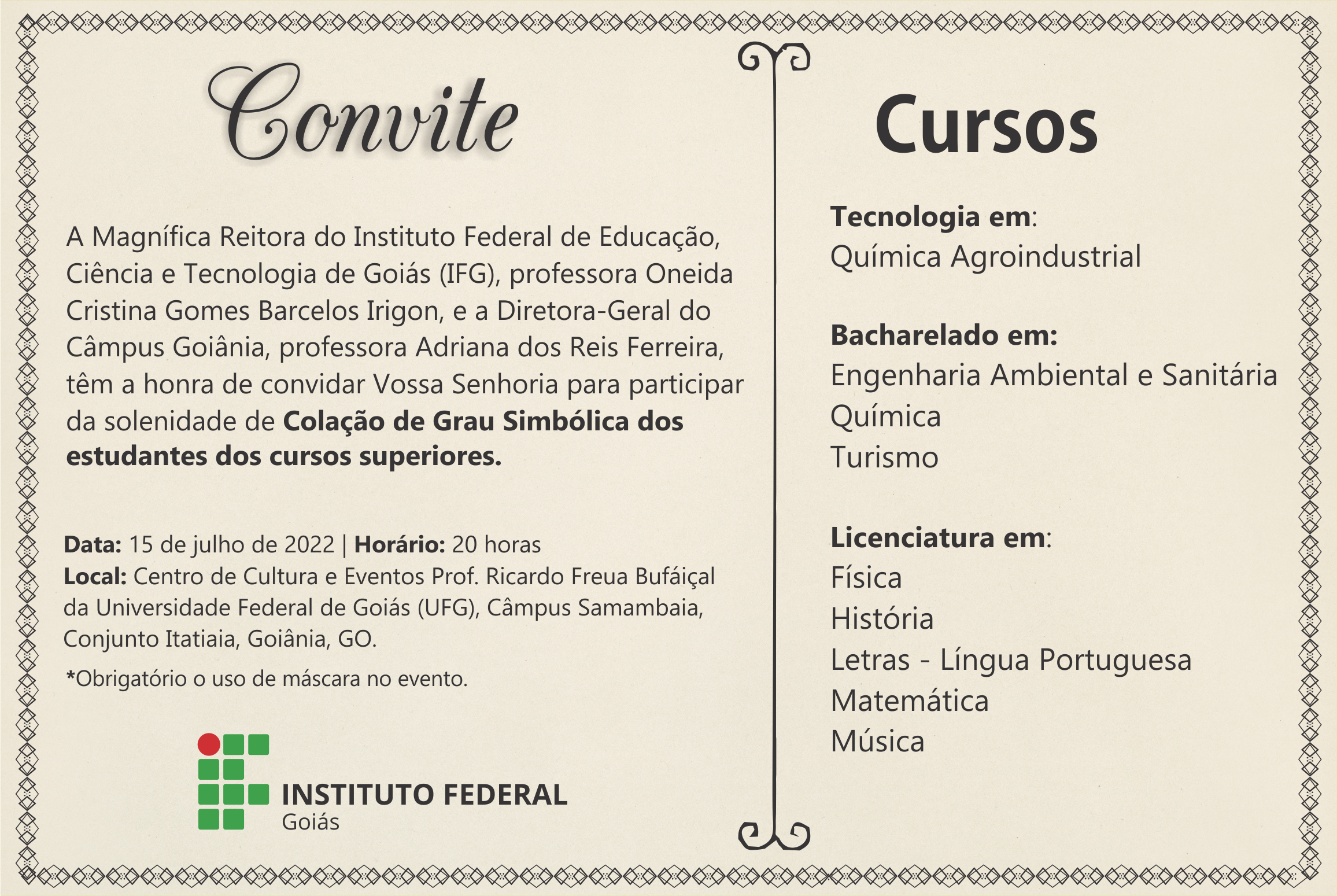 O Câmpus Goiânia do Instituto Federal de Goiás (IFG) realiza, no dia 15 de julho, a cerimônia de Colação de Grau Simbólica dos formandos dos cursos superiores da unidade, que colaram grau por ato administrativo durante a pandemia. O evento será às 20 horas, no Centro de Cultura e Eventos Professor Ricardo Freua Bufáiçal, da Universidade Federal de Goiás, localizado no Campus Samambaia, Conjunto Itatiaia.