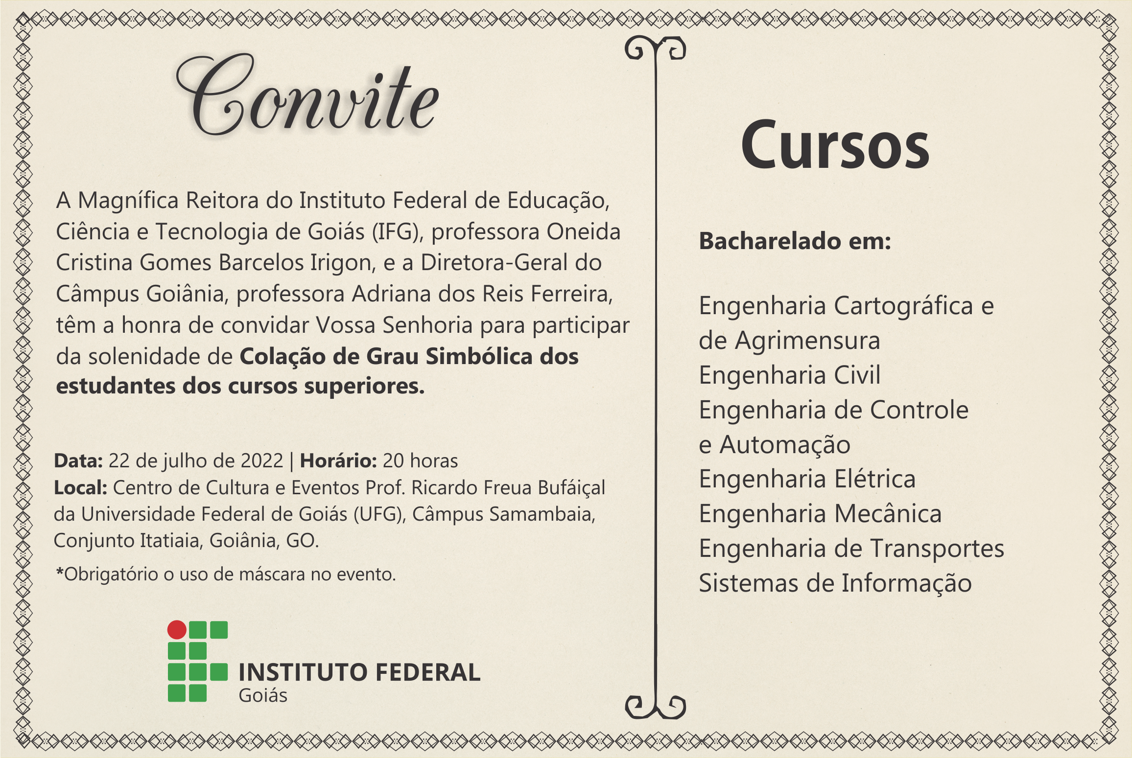 O Câmpus Goiânia do Instituto Federal de Goiás (IFG) realiza, no dia 22 de julho, a segunda cerimônia de Colação de Grau Simbólica dos formandos dos cursos superiores da unidade, que colaram grau por ato administrativo durante a pandemia. O evento será às 20 horas, no Centro de Cultura e Eventos Professor Ricardo Freua Bufáiçal, da Universidade Federal de Goiás, localizado no Campus Samambaia, Conjunto Itatiaia.