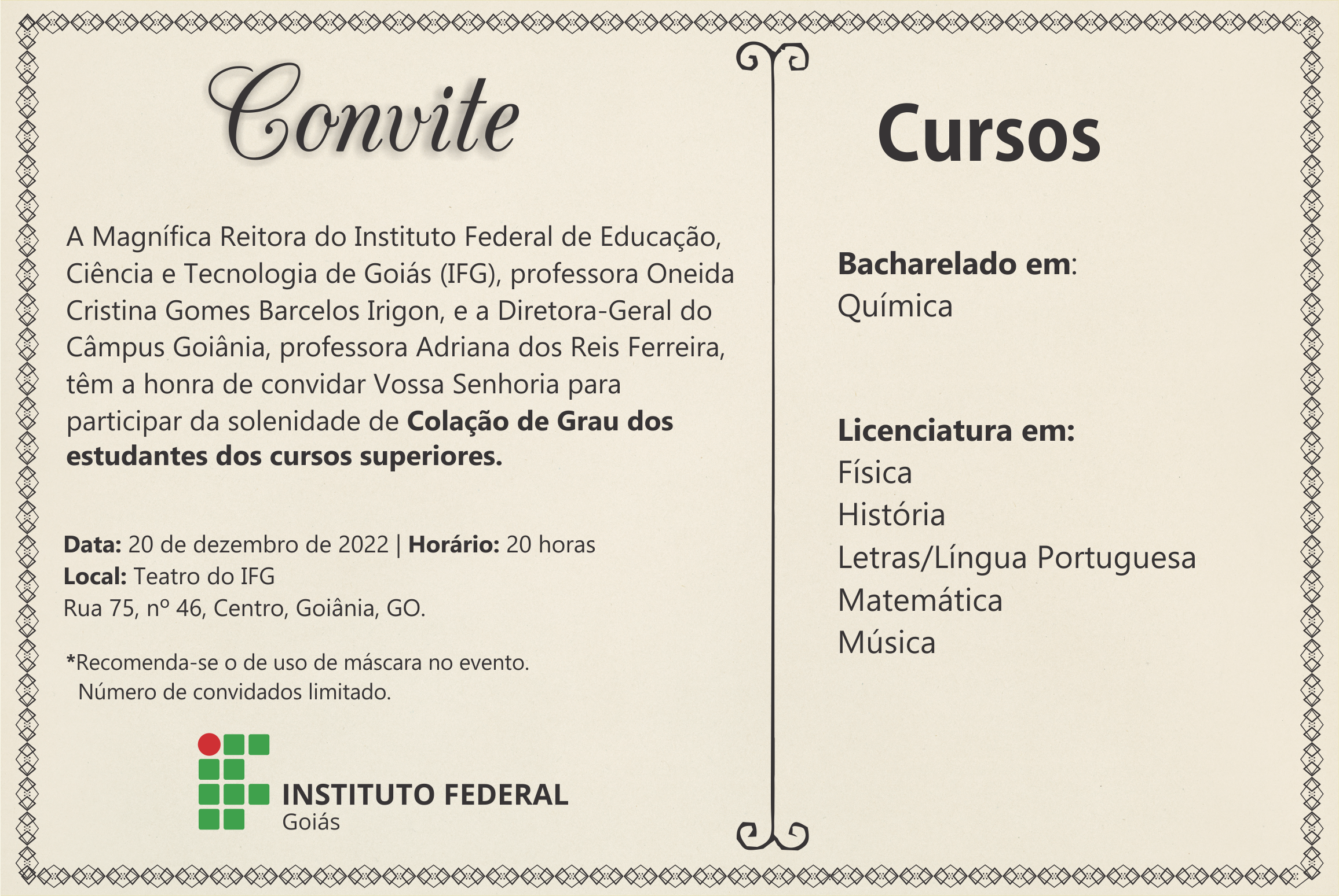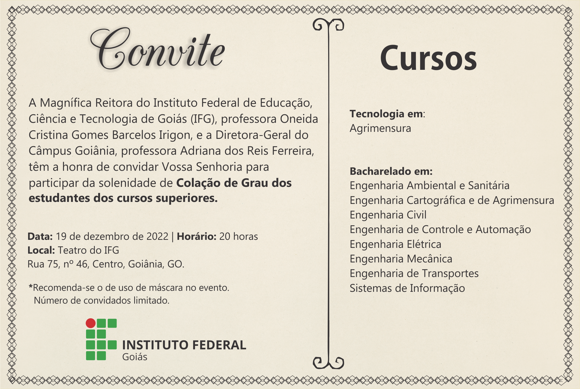O Câmpus Goiânia do Instituto Federal de Goiás (IFG) realiza, nos dias 19 e 20 de dezembro, as cerimônias de Colação de Grau dos formandos dos cursos superiores da unidade. Os eventos serão às 20 horas, no Teatro do IFG, localizado no Câmpus Goiânia.