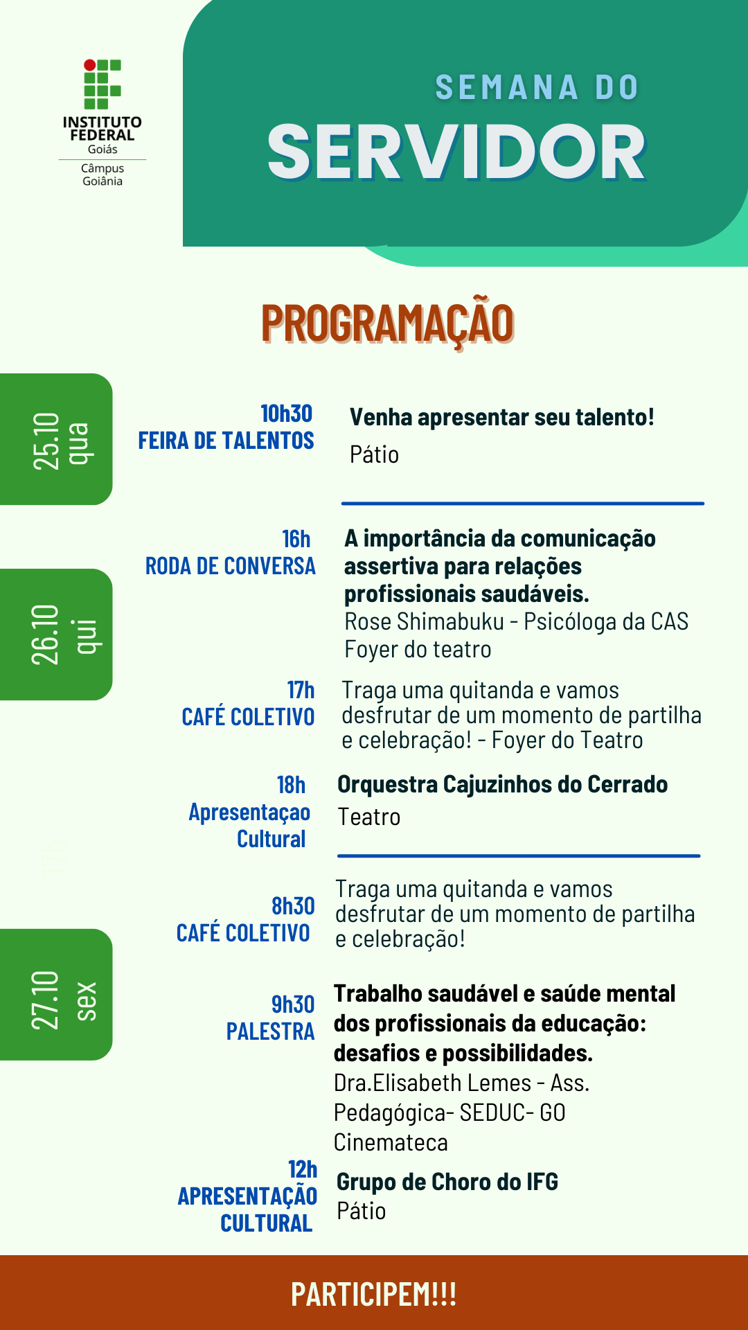 O último dia da ação (27) será aberto com uma café da manhã coletivo, realizado às 8h30 na Sala de Servidores. Às 9h30, na Cinemateca, ocorrerá a palestra “Trabalho saudável e saúde mental dos profissionais da educação: desafios e possibilidades”, com a Dra. Elisabeth Lemes. As celebrações serão encerradas com a animação do Grupo de Choro do IFG, que se apresenta às 12h no pátio.