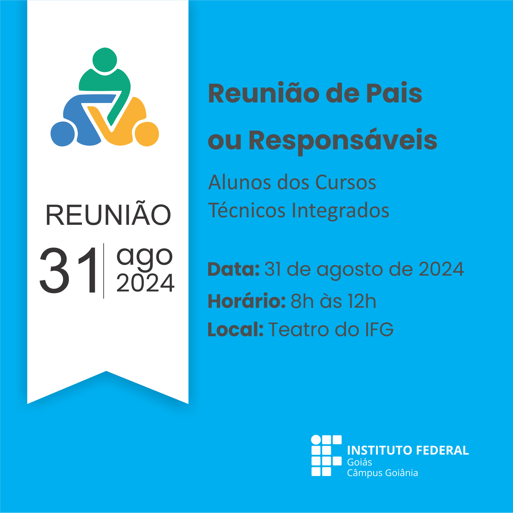 O Câmpus Goiânia do Instituto Federal de Goiás (IFG) realiza no próximo dia 31 de agosto reunião de pais e responsáveis dos estudantes dos cursos técnicos integrados, referente ao primeiro bimestre de 2024. O evento será das 8h às 12 horas.