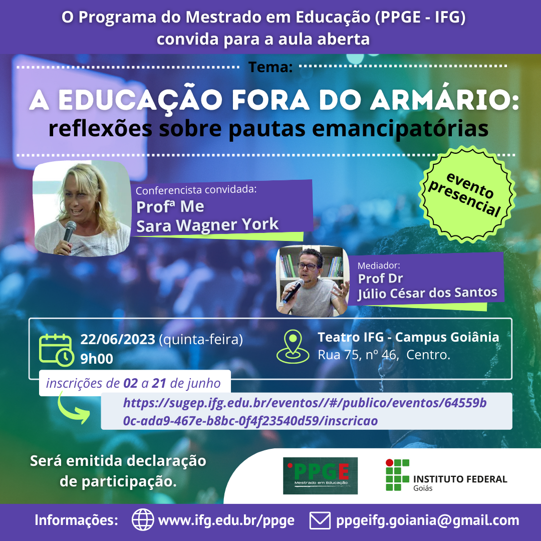 Tema: A educação fora do armário: reflexões sobre pautas emancipatórias | 22 de junho | Horário: 9 horas | Local: Teatro