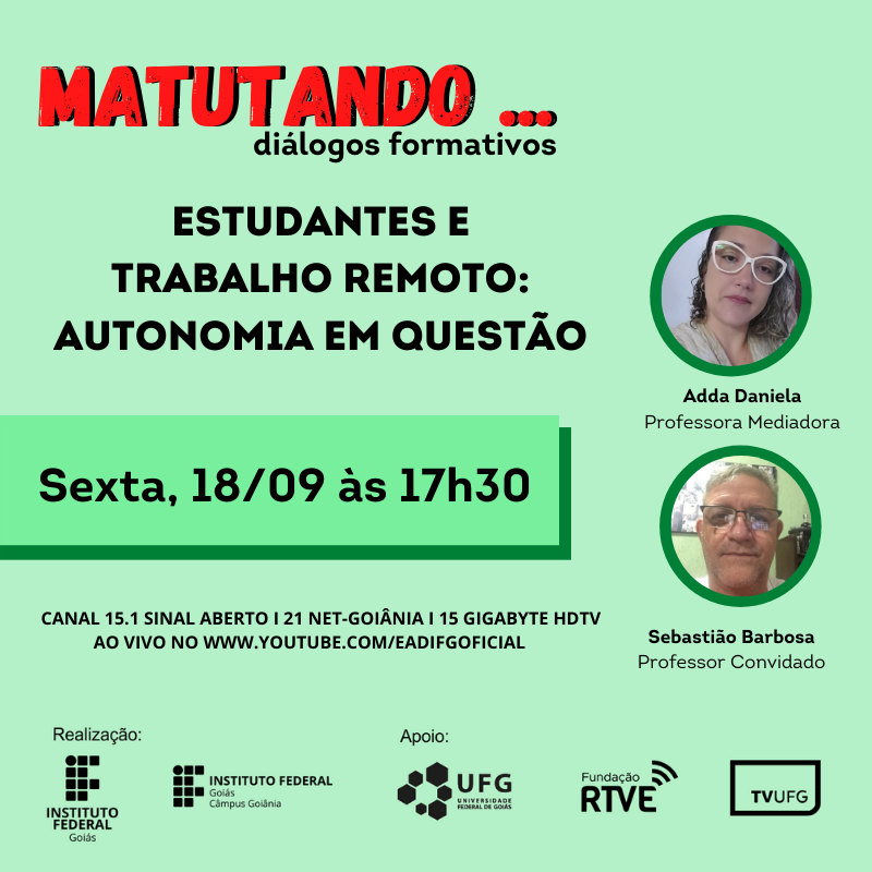 Data: 18.09 (sexta-feira) | Horário: 17h30 |Transmissão ao vivo: TV UFG e também pelo canal da EaD do IFG no YouTube