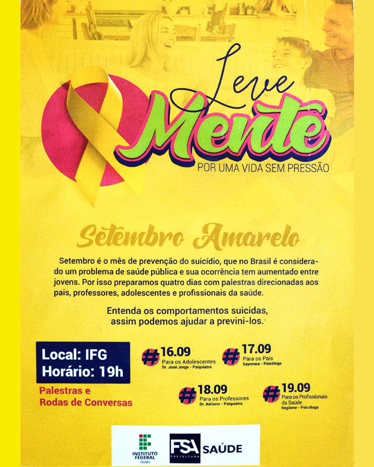 Na próxima semana o Teatro Guaiá e demais locais do Câmpus Formosa do Instituto Federal de Goiás (IFG) recebem o LeveMente - Por uma vida sem pressão, organizado pela Secretaria Municipal de Saúde. O evento envolve uma série de palestras e rodas de conversas para tratar de temas que discutem a valorização à vida, já que é o mês do Setembro Amarelo.