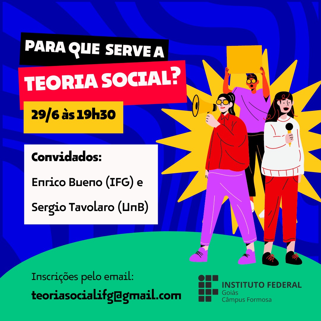 Na próxima quarta-feira à noite, o curso de Licenciatura em Ciências Sociais do Câmpus Formosa estará realizando a palestra "Para que serve a Teoria Social?", que será mediada pela professora Mariana Toledo Ferreira e aberta a todos os interessados. Como convidados participantes, estarão o professor da área de Sociologia do Câmpus Anápolis, Enrico Bueno, e o professor da Universidade de Brasília (UnB), Sergio Tavolaro.