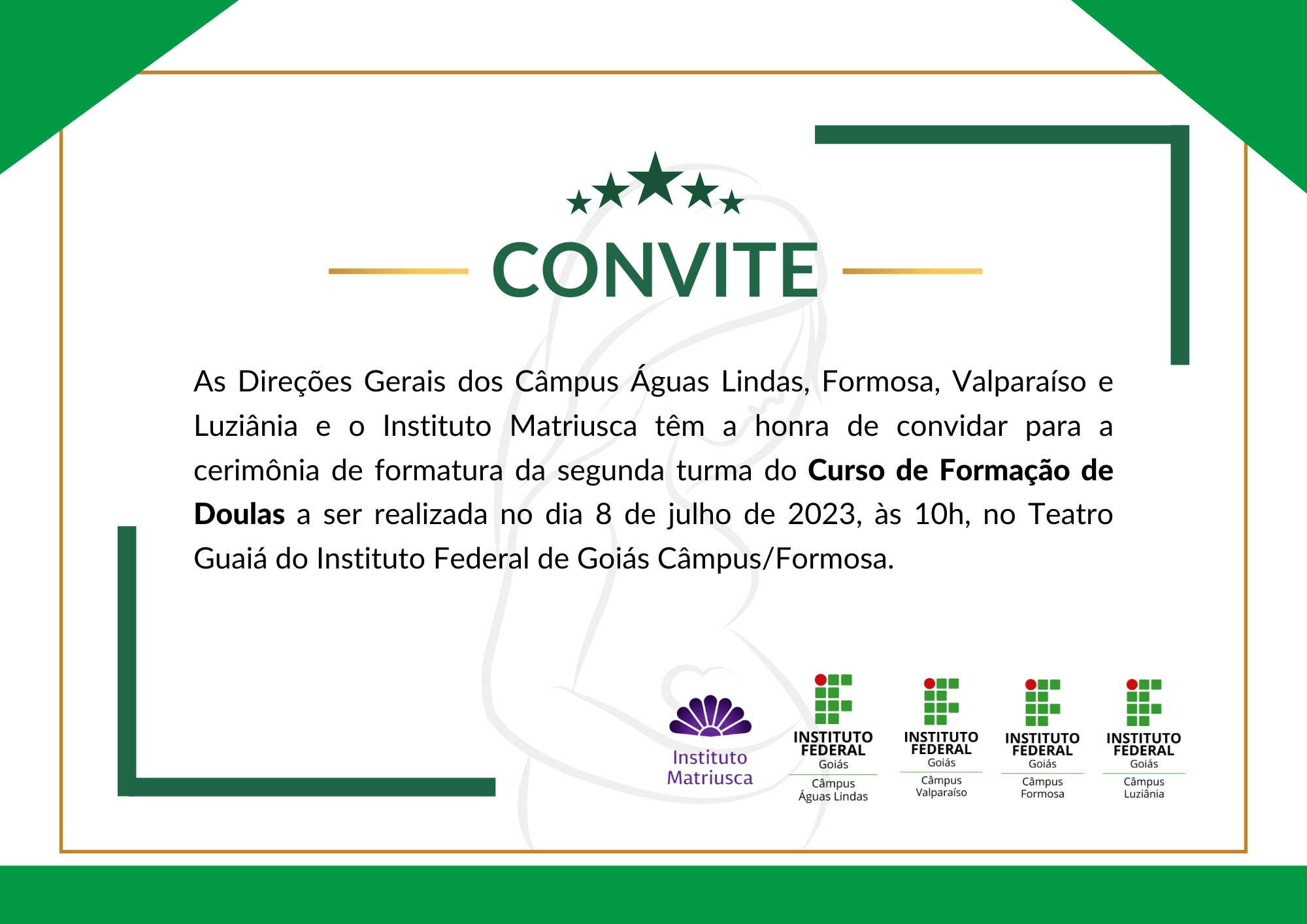 Mais uma turma do Curso de Formação de Doulas será certificada pelo IFG. A solenidade será realizada no sábado, 8 de julho, às 10h, no Teatro Guaiá do Câmpus Formosa do Instituto Federal de Goiás. As comunidades acadêmica e formosense estão convidadas a assistir à cerimônia.