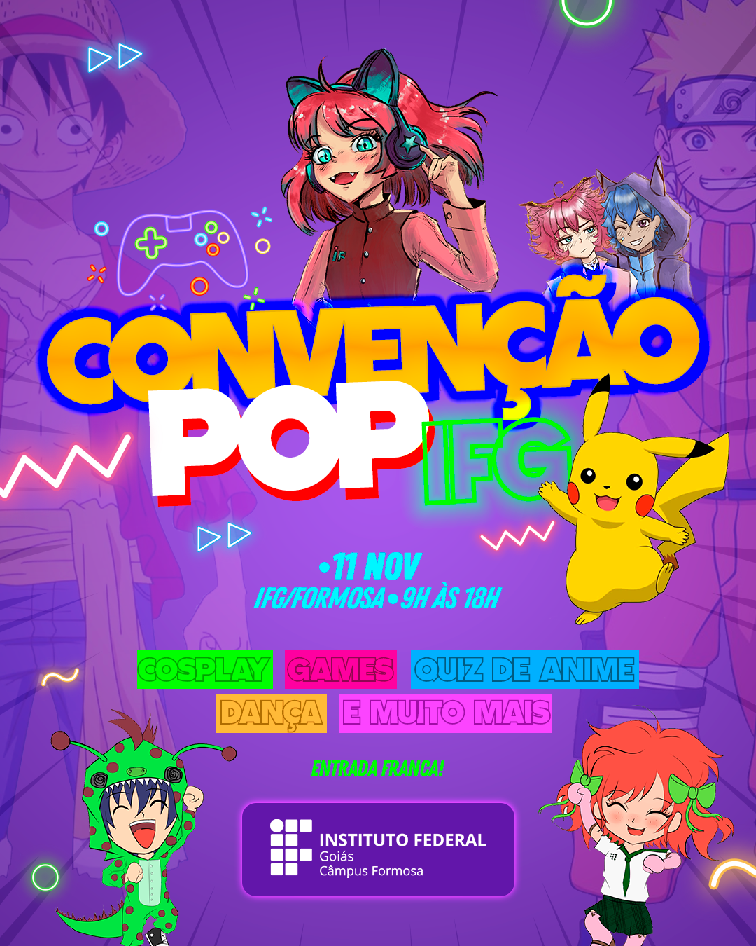 O projeto de extensão Convenção Pop IFG vem com tudo neste mês de novembro. O evento, que está em sua terceira edição, traz o mundo geek para o Câmpus Formosa, com a participação de toda a comunidade formosense. Haverá competições, animes, kpop e muita cultura oriental.