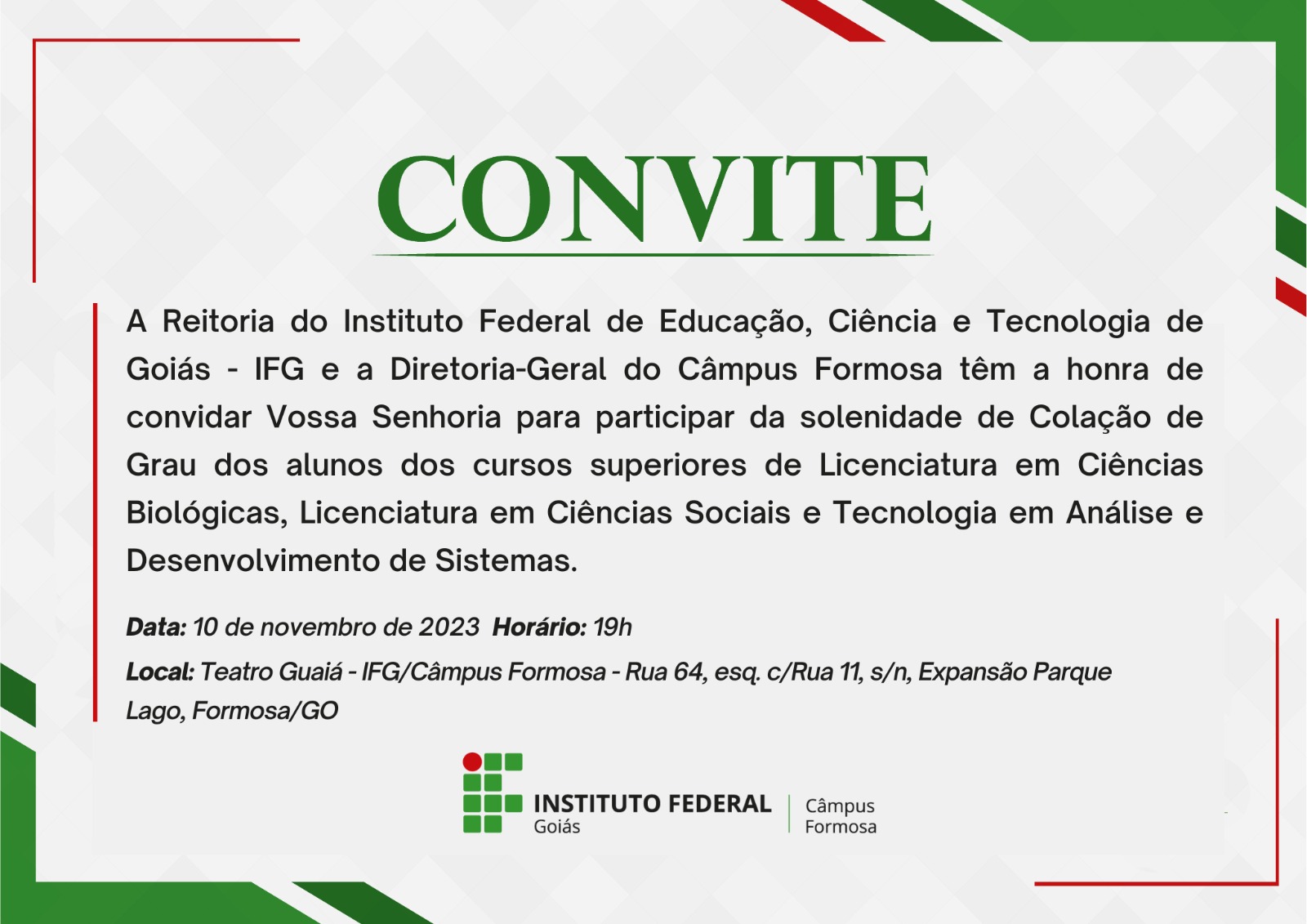 O Câmpus Formosa do Instituto Federal de Goiás/IFG convida a comunidade para assistir à Cerimônia de Colação de Grau dos cursos de graduação Licenciatura em Ciências Biológicas, Licenciatura em Ciências Sociais e Tecnologia em Análise e Desenvolvimento de Sistemas.
