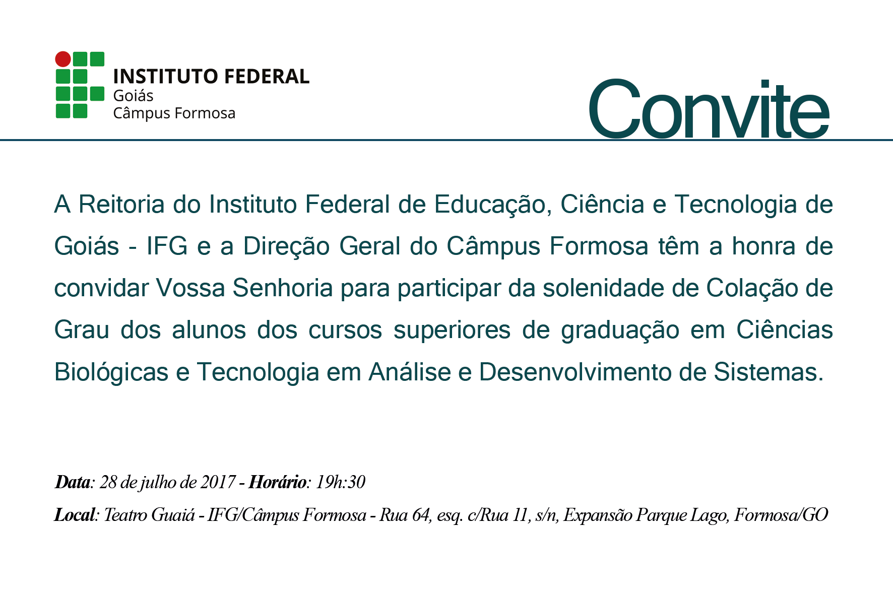 O Reitor e o Diretor-Geral do Câmpus Formosa do Instituto Federal de Goiás convidam toda a comunidade para a solenidade de Colação de Grau da sexta turma do curso de Licenciatura em Ciências Biológicas e da primeira turma de Tecnologia em Análise e Desenvolvimento de Sistemas, a se realizar no dia 28 de julho de 2017, às 19h30min, no Teatro Guaiá do Câmpus Formosa.