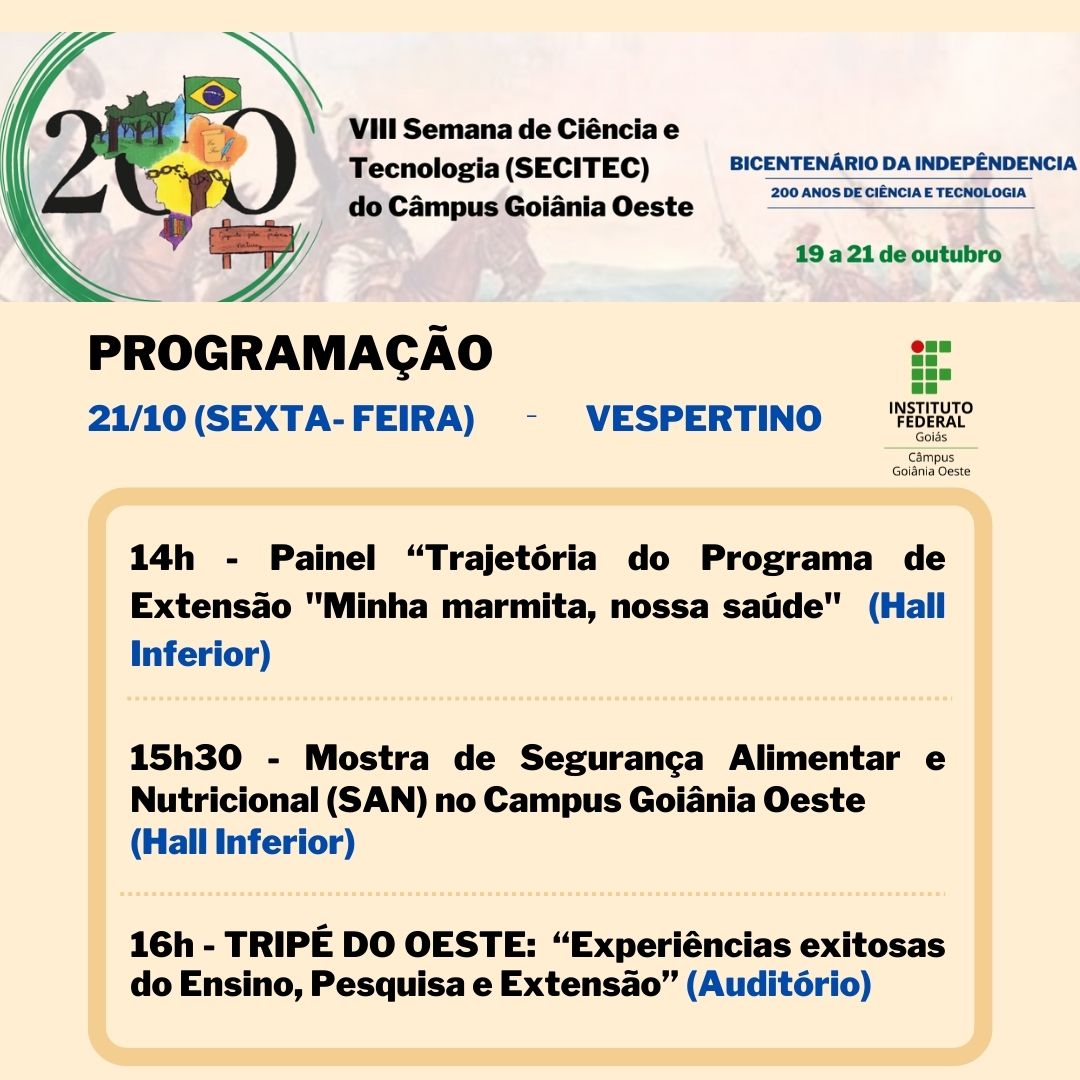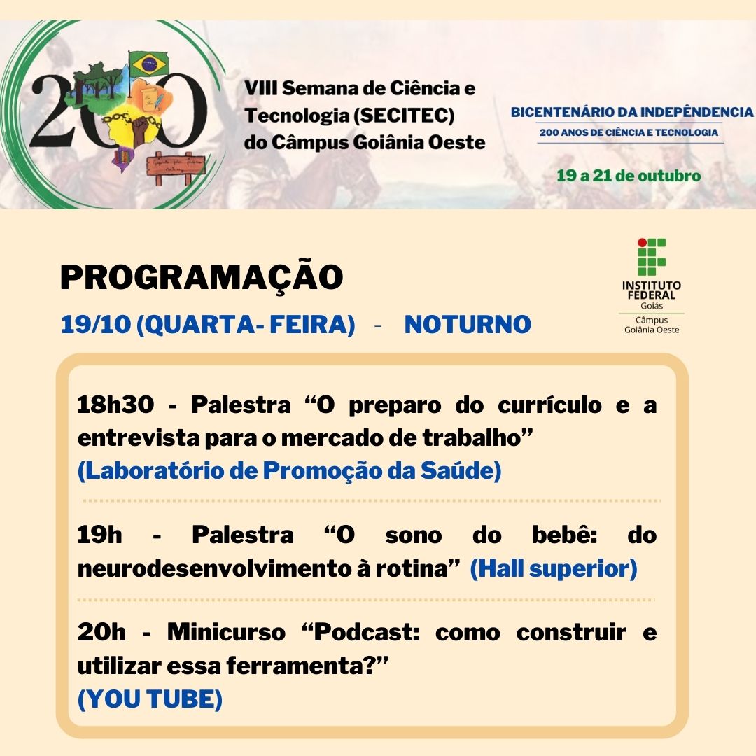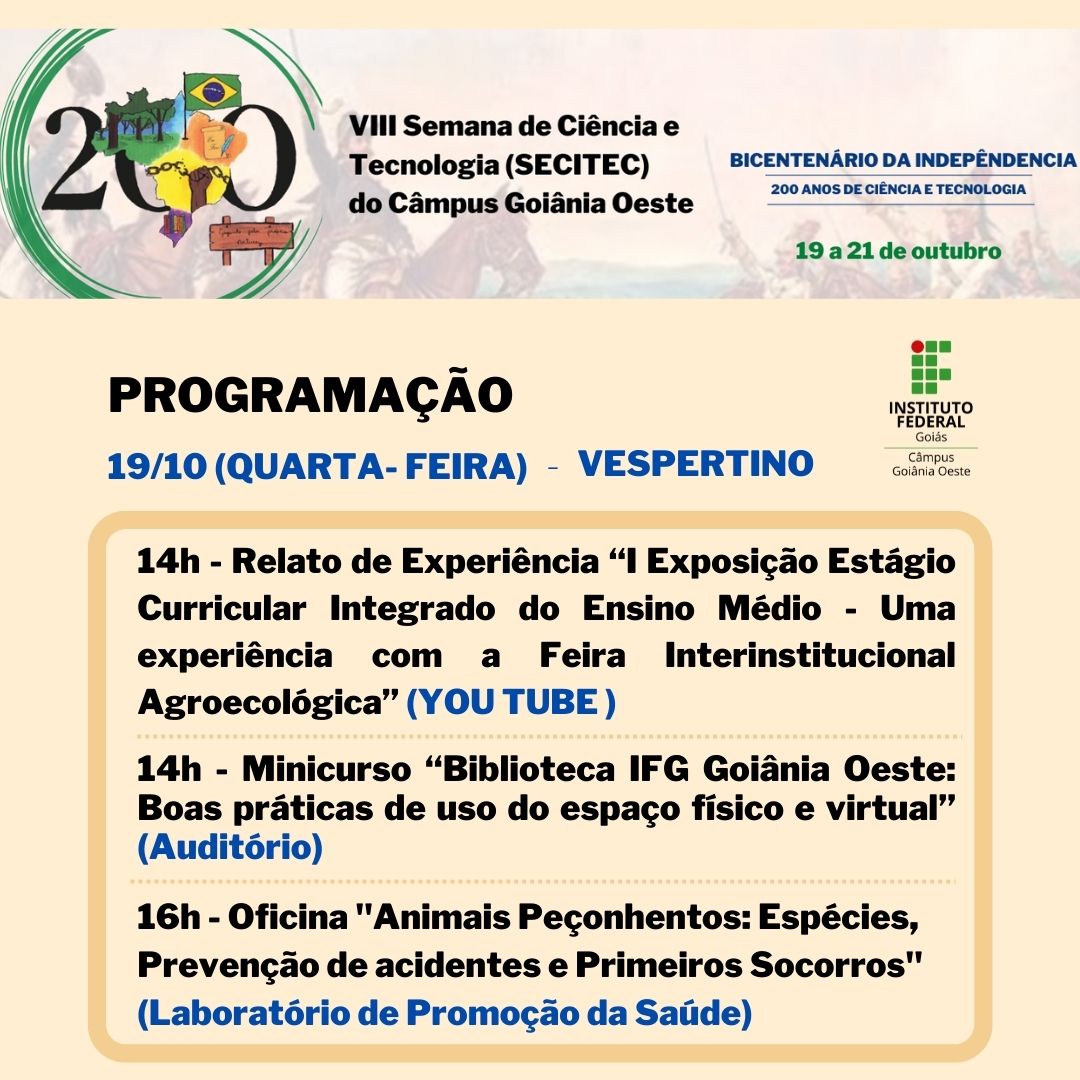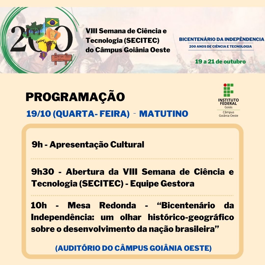 Seguindo a proposta da 19ª Semana Nacional de Ciência e Tecnologia, a SECITEC do IFG - Câmpus Goiânia Oeste terá como tema “Bicentenário da Independência: 200 anos de Ciência, Tecnologia e Inovação no Brasil”.