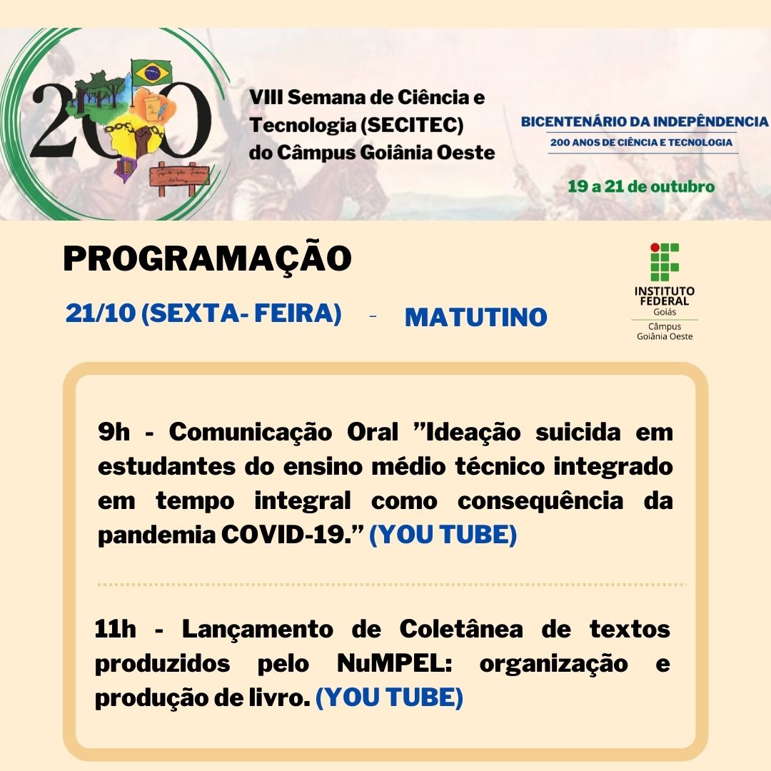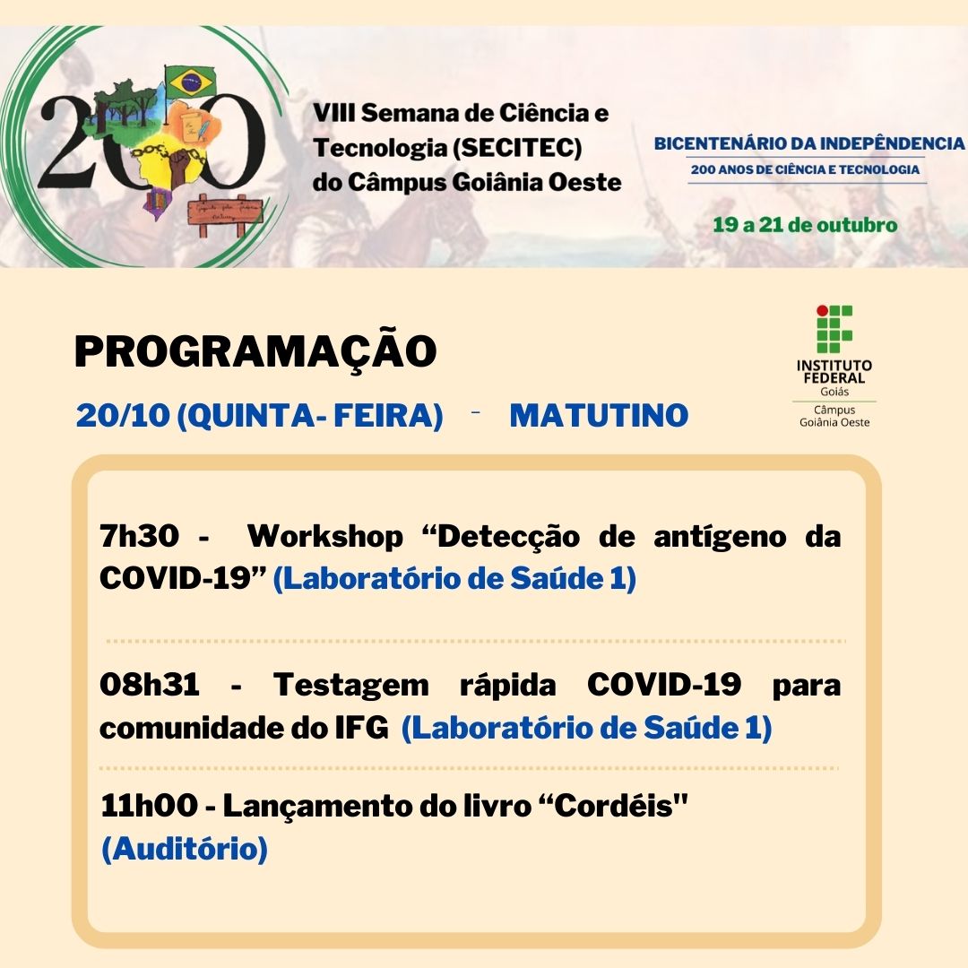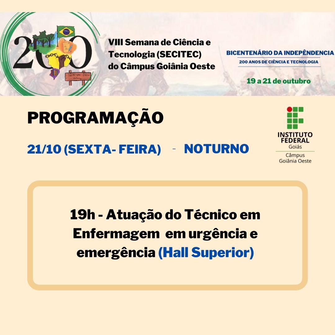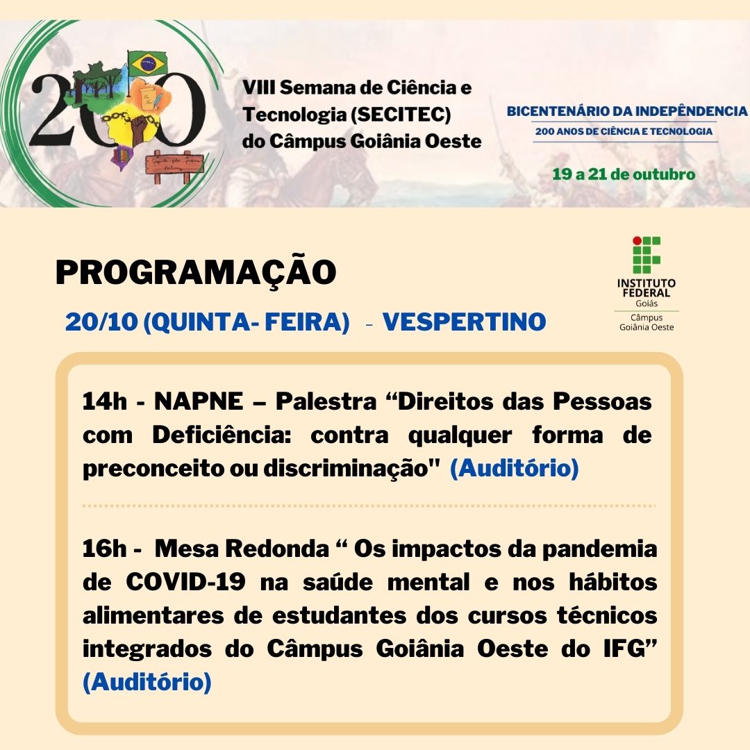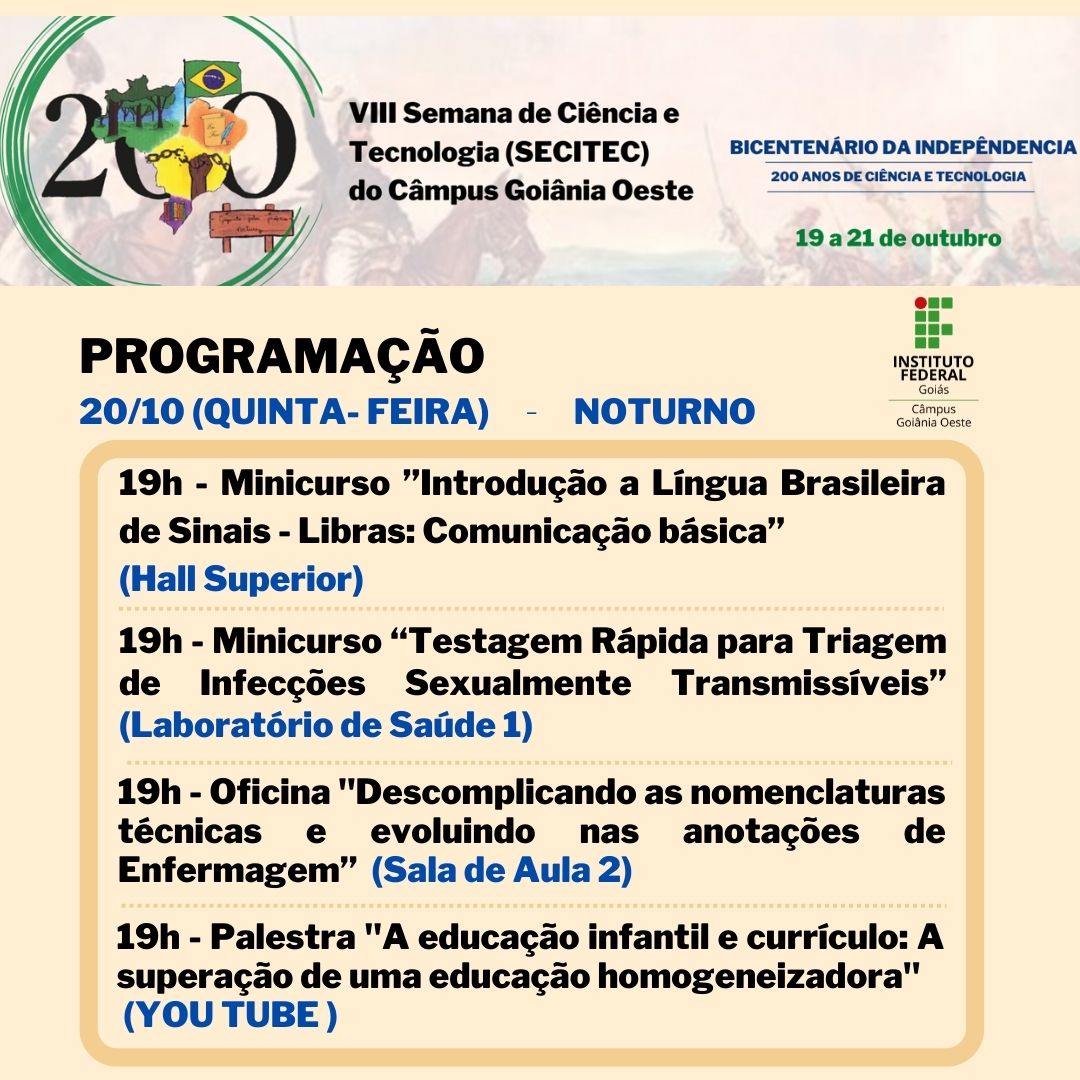 Seguindo a proposta da 19ª Semana Nacional de Ciência e Tecnologia, a SECITEC do IFG - Câmpus Goiânia Oeste terá como tema “Bicentenário da Independência: 200 anos de Ciência, Tecnologia e Inovação no Brasil”.