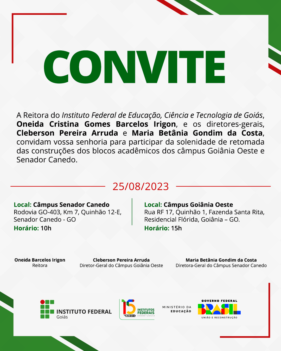 A Reitoria do Instituto Federal de Goiás realizará , no dia 25 de agosto, solenidades para anunciar a retomada das obras dos blocos acadêmicos inacabados dos câmpus Senador Canedo e Goiânia Oeste. Autoridades municipais, estaduais e federais estarão presentes, e toda a comunidade acadêmica é convidada a participar.