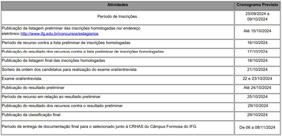 As inscrições são gratuitas e devem ser feitas no site do IFG, no menu Concursos > Seleção de Estagiários, clicando na seleção de estagiários para Formosa. Para efetuar a inscrição, o candidato deve preencher o Formulário Eletrônico de Inscrição e fazer o upload em arquivo único .PDF na ordem disposta no Edital nº 22/2024, dos seguintes documentos: Formulário Eletrônico de Inscrição; RG e CPF; Declaração de Matrícula emitida nos últimos 30 dias referente ao curso de Pedagogia; Histórico Escolar atualizado; e Currículo Pessoal acompanhado da documentação comprobatória para pontuação.
