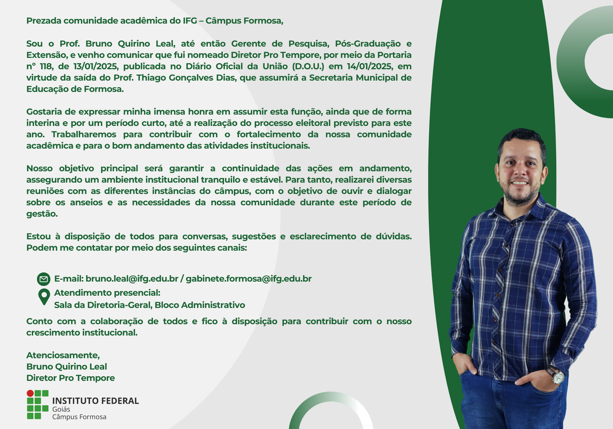 A partir de hoje, assume a função de diretor-geral pro tempore do Câmpus Formosa do Instituto Federal de Goiás (IFG) o professor Bruno Quirino Leal. A Portaria Nº 0118, que nomeia o docente ao cargo, foi publicada ontem, pelo Gabinete da Reitoria do IFG, e passa a ter validade com a publicação no Diário Oficial da União (DOU) desta terça-feira, 14.
