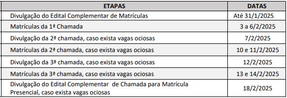 Caso haja vagas ociosas após a 1ª Chamada, serão realizadas chamadas subsequentes, conforme o calendário abaixo: