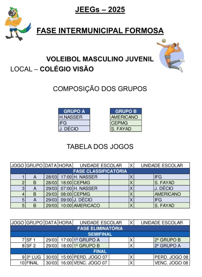 Nesta sexta-feira, 28 de março, começa a Fase Intermunicipal dos Jogos Estudantis do Estado de Goiás (JEEGs) 2025, e os times de voleibol feminino e masculino do Câmpus Formosa do Instituto Federal de Goiás (IFG) participam da competição pela primeira vez.