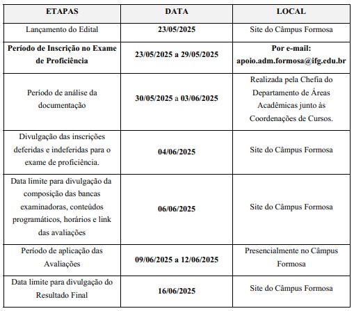 As inscrições para o Exame de Proficiência estão abertas até 29 de maio, quinta-feira. Para participar, os estudantes devem enviar o formulário de inscrição e a documentação comprobatória em formato PDF para o e-mail apoio.adm.formosa@ifg.edu.br .