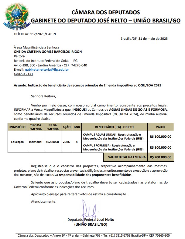 O Câmpus Formosa do Instituto Federal de Goiás (IFG) foi contemplado, neste primeiro semestre, com uma emenda parlamentar individual no valor de R$ 100 mil, oriunda do Orçamento Geral da União (OGU/LOA 2024). A emenda foi destinada pelo Deputado Federal José Nelto (UB/GO) e possibilitará a aquisição de novos equipamentos que atenderão a diferentes setores da unidade.
