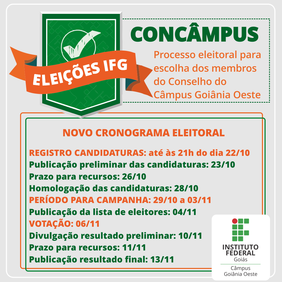 Acesse aqui o novo Cronograma estabelecido pela Comissão Eleitoral Local do Câmpus Goiânia Oeste.