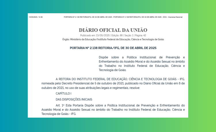 Instituição publica Política e fortalece ações de combate aos assédios no âmbito do IFG Portaria da Política Institucional de Prevenção e Enfrentamento do Assédio Moral e do...