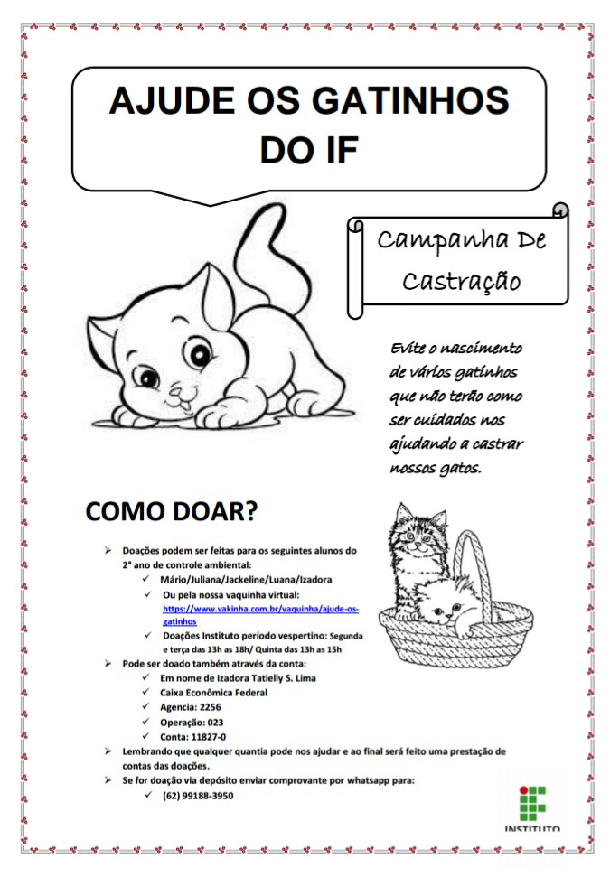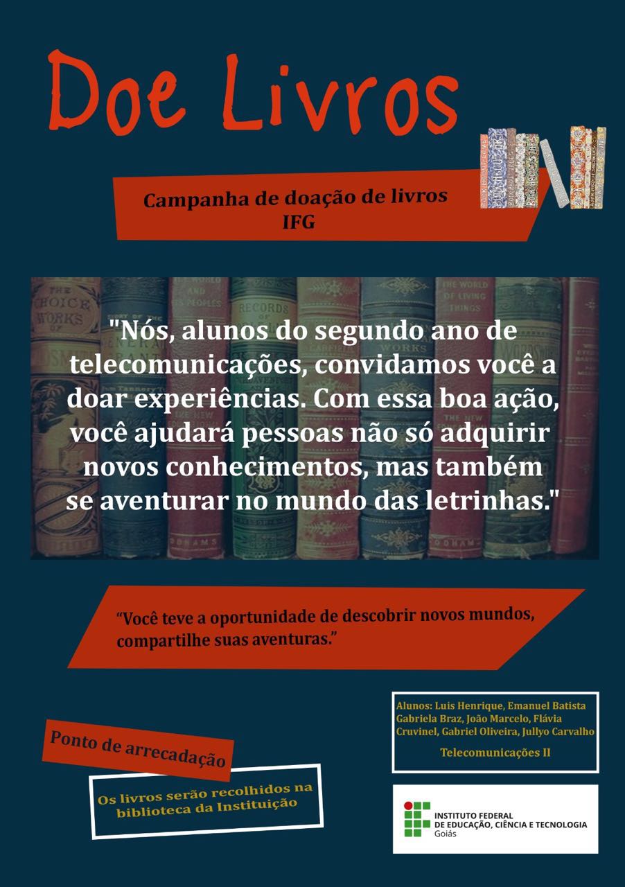 Durante aula de Língua Portuguesa, alunos das turmas de 2º ano dos cursos técnicos integrados em Controle Ambiental e Telecomunicações tiveram a ideia de usar a teoria vista em sala para elaborar projetos beneficentes. A aula era sobre o gênero cartaz, ministrada pela professora Ariana Lobo. A atividade proposta: confeccionar cartazes. E por que não fazer peças com um objetivo real? A partir disso, os estudantes criaram cinco projetos, todos com o intuito de fazer o bem, que envolvem desde arrecadação de alimentos para instituições de caridade, doação de livros, até castração dos gatos que vivem no IFG – Câmpus Goiânia.