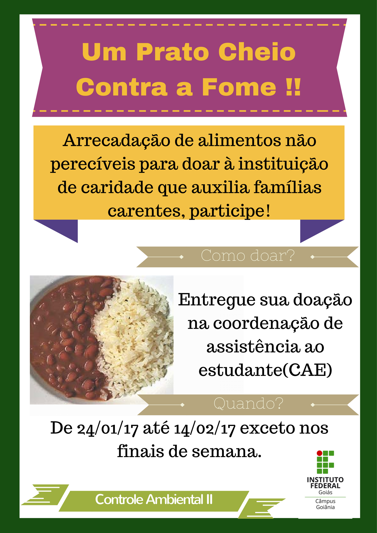 A intenção do projeto é arrecadar alimentos que serão destinados à instituição de caridade Núcleo Assistencial André Luiz. Os donativos podem ser entregues na Coordenação de Assistência Estudantil do câmpus, até o dia 14 de fevereiro.