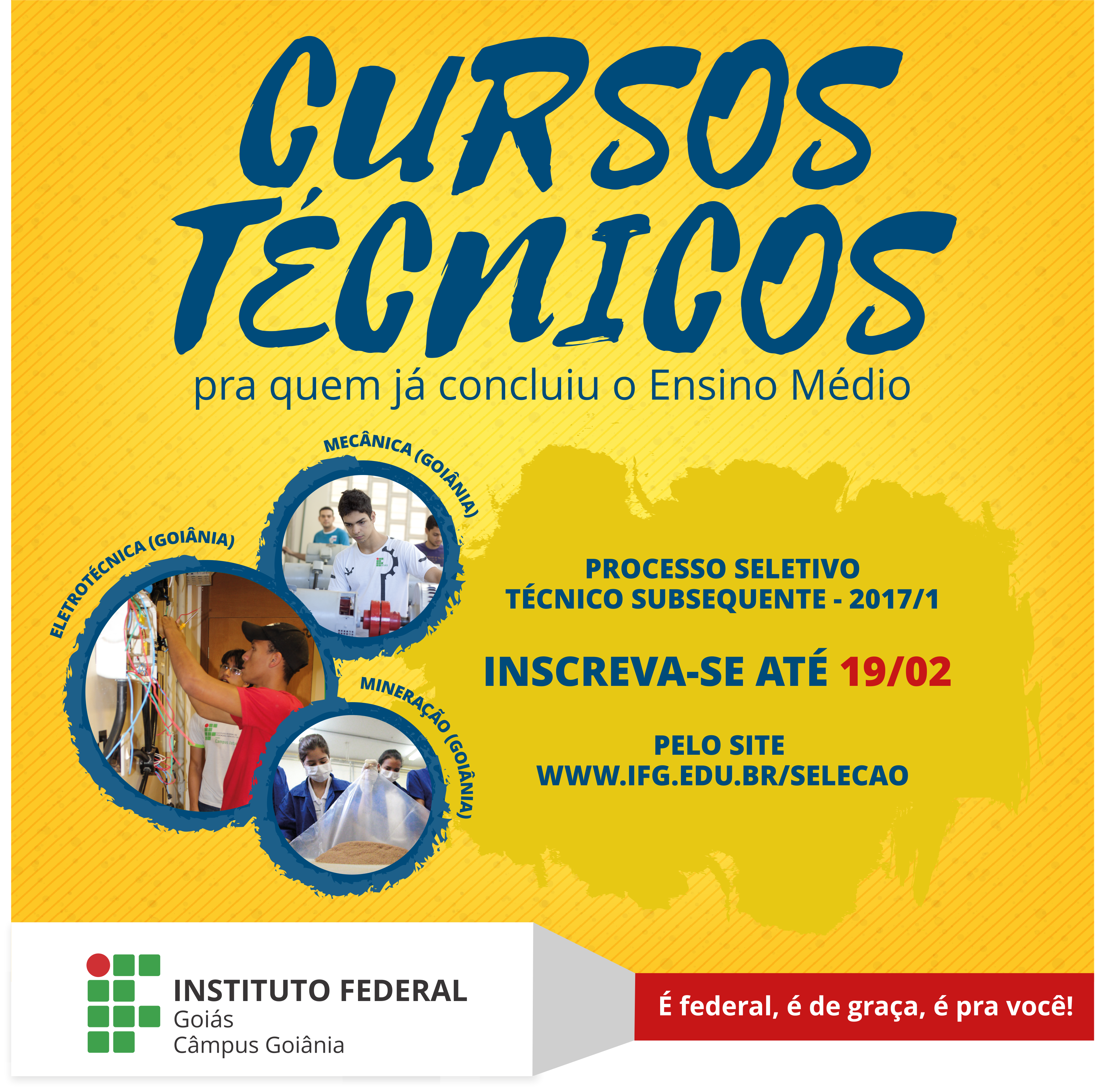 Termina neste domingo, 19 de fevereiro, o período de inscrição no processo seletivo para os cursos técnicos subsequentes do Câmpus Goiânia. Ao todo, são oferecidas 90 vagas para os cursos de Eletrotécnica (30 vagas), Mecânica (30 vagas) e Mineração (30 vagas), para o primeiro semestre de 2017. Os cursos são gratuitos e destinados para pessoas que concluíram o ensino médio e desejam fazer um curso técnico.