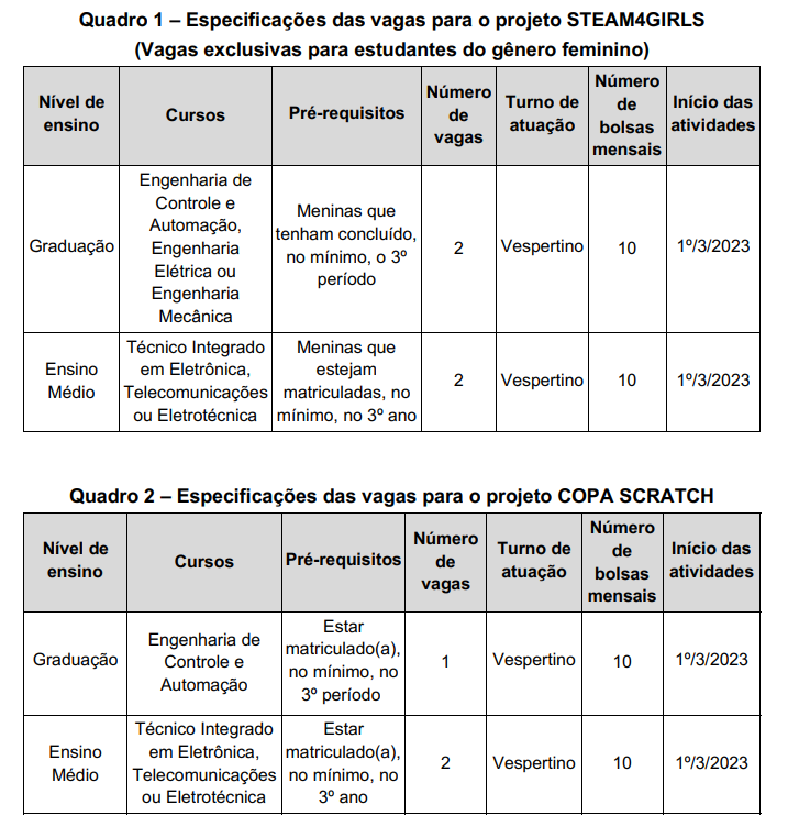 Para participar da seleção o estudante deve estar regulamente matriculado em um dos cursos listados no quadro de vagas do edital (ver abaixo) e se atentar ao pré-requisito solicitado. A seleção dos candidatos será baseada no coeficiente de rendimento acadêmico e realização de entrevista. Uma das vagas destinadas aos estudantes de ensino médio deverá, obrigatoriamente, ser ocupada por aluno participante de algum programa de assistência estudantil ou cotista, conforme o plano de trabalho da ação de extensão*. Os bolsistas selecionados atuarão no turno vespertino, tendo como atribuições organizar oficinas, monitorar atividades e desenvolver planos de trabalhos, sob orientação da coordenação dos projetos. Para isso, receberão bolsas de R$ 400 (bolsistas de graduação) e R$ 200 (bolsistas de cursos técnicos) durante 10 meses.