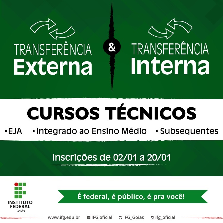 Estudantes de cursos técnicos de nível médio têm até amanhã, 20, para se inscreverem no processo seletivo destinado às transferências para o IFG (transferência externa) e também às transferências de curso dentro do IFG (transferência interna). Para o Câmpus Goiânia, são oferecidas 90 vagas, entre transferências interna e externa, nos cursos técnicos integrados ao ensino médio em Controle Ambiental, Edificações, Eletrônica, Mineração, Telecomunicações, Cozinha (EJA), Transporte Rodoviário (EJA) e para o técnico subsequente (pós-médio) em Mineração.