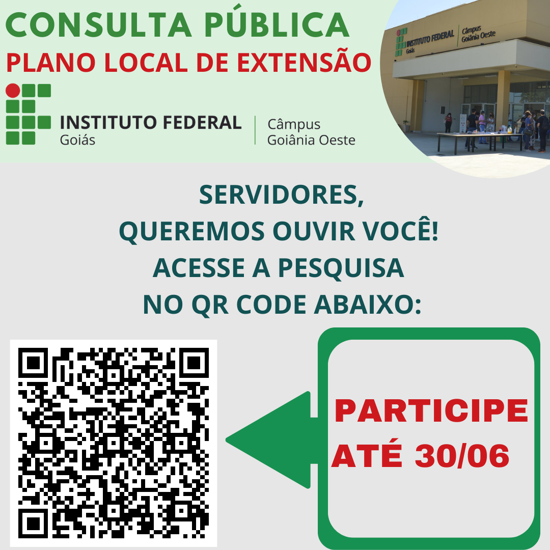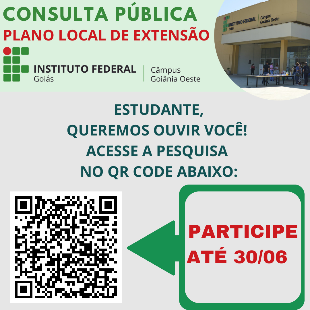 Em sua nova sede, desde o ano de 2020, o Câmpus Goiânia Oeste do Instituto Federal de Goiás (IFG) tem como prioridade contribuir com o desenvolvimento da região em que está situado, e de sua comunidade. Essas contribuições se dão não apenas por meio do Ensino e Pesquisa, mas também com ações de Extensão. Para ampliar a sua atuação nas regiões Oeste, Noroeste, Sudoeste e Mendanha, o Câmpus Goiânia Oeste do IFG está elaborando o Plano Local de Extensão (PLE) com o objetivo de construir e consolidar Ações de Extensão que beneficiem a comunidade externa e interna. Essa construção passa pela participação da comunidade moradora dessas regiões, mas também dos estudantes e servidores do Câmpus Goiânia Oeste. Essa participação poderá ser realizada por meio da Consulta Pública, promovida pelo Comitê Local de Extensão, que está aberta e deverá ser respondida até o final desse mês, dia 30 de junho.