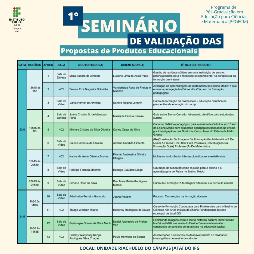O Câmpus Jataí do Instituto Federal de Goiás (IFG) promove nos dias 23 e 24 de junho o 1º Seminário de Validação das Propostas de Produtos Educacionais do doutorado do Programa de Pós-Graduação em Educação para Ciências e Matemática. O evento tem como foco a apresentação das propostas de produtos educacionais da primeira turma do doutora profissional em Educação para Ciências e Matemática. No total, 13 propostas serão apresentadas e avaliadas por bancas formadas por docentes ligados ou não ao programa. O Seminário será inteiramente presencial, a partir das 13:45, na Unidade Riachuelo. As atividades serão certificadas para os participantes ouvintes, que deverão se inscrever aqui