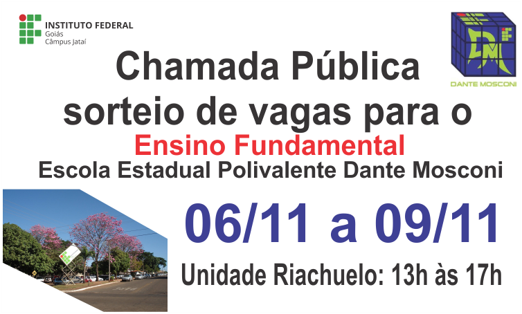 O Instituto Federal de Goiás (IFG) – Câmpus Jataí e a Escola Estadual Polivalente Dante Mosconi divulgam a Chamada Pública para o sorteio de vagas da segunda fase do Ensino...