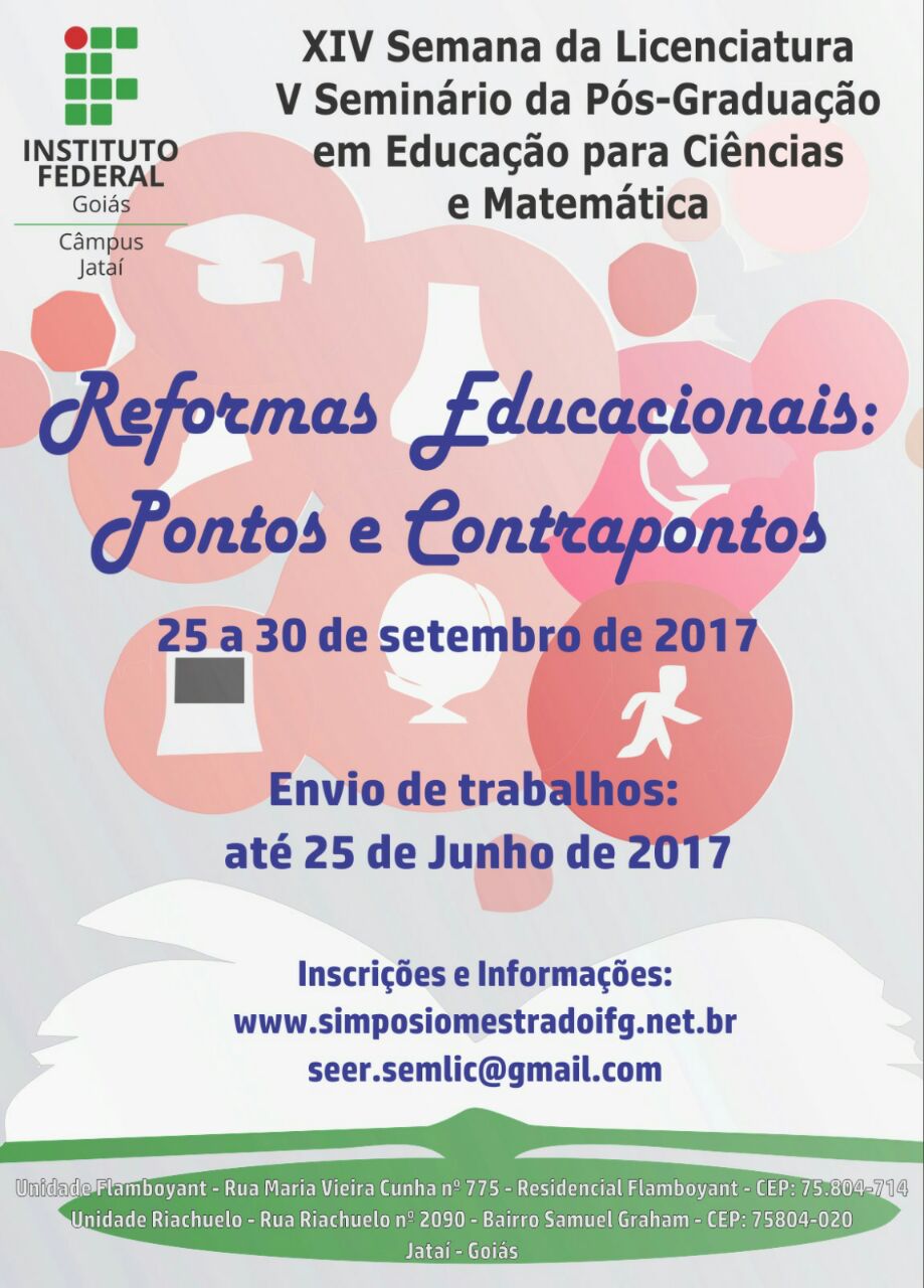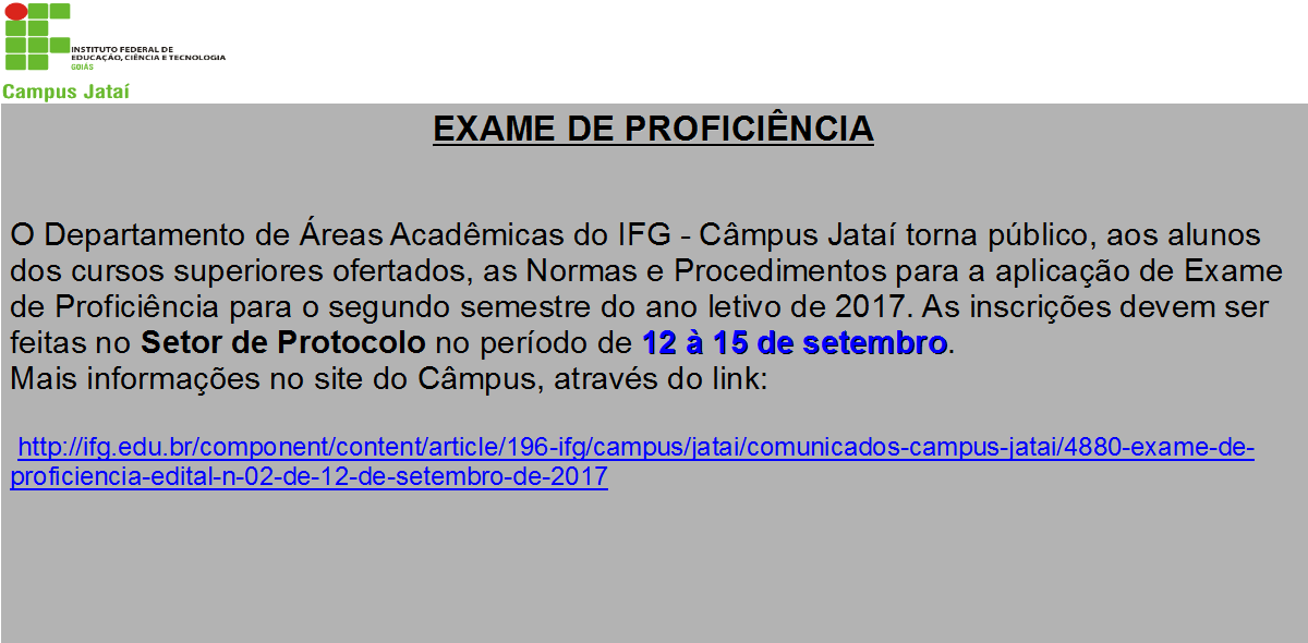 O Instituto Federal de Educação, Ciência e Tecnologia de Goiás (IFG) - Campus Jataí reabre período de inscrições, de 14 de setembro a 14 de outubro de 2017, para o PROJETO DE...