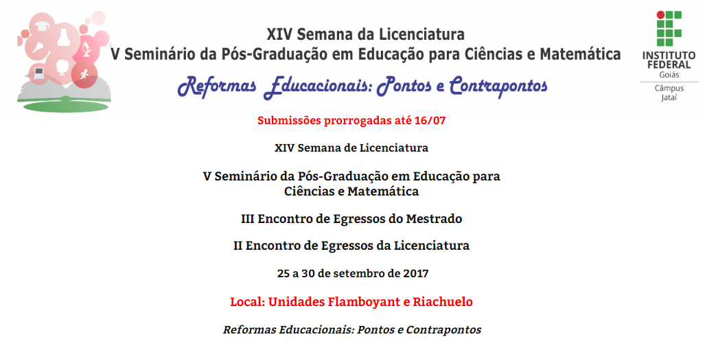 A comissão organizadora da XIV Semana da Licenciatura/V Seminário da Pós-Graduação em Educação para Ciências e Matemática informa que o prazo de submissão de trabalhos para o...