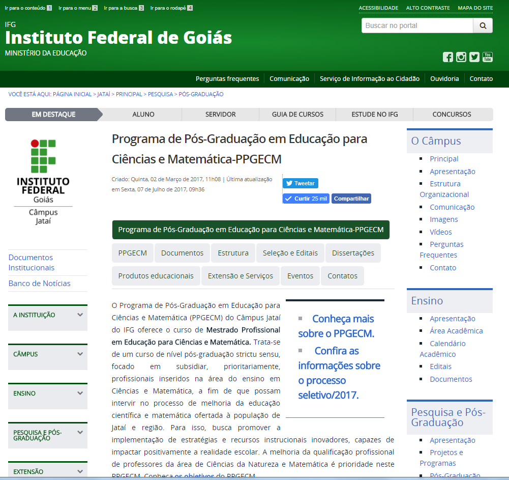 Já está no ar a nova página da Pós-Graduação do IFG-Câmpus Jataí O Programa de Pós-Graduação em Educação para Ciências e Matemática (PPGECM) informa que sua nova página...